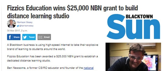 Blacktown Sun; Fizzics Education wins $25K NBN grant to build distance learning studio. 30 March, 2017.