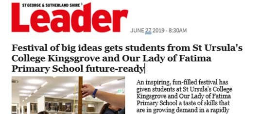 St George Leader; Festival of big ideas gets students from St Ursula’s College Kingsgrove and Our Lady of Fatima Primary School future-ready. June 27, 2018