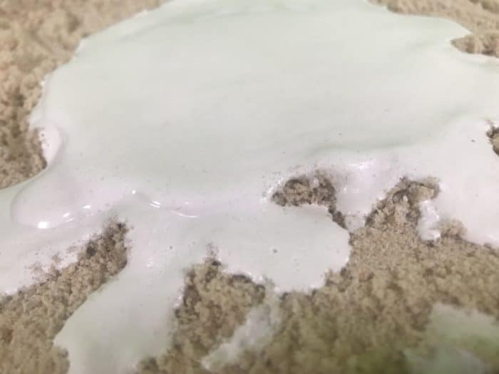After rain, mix up the plaster of paris with water. Don’t make it too thick as you want a good mold. You may want to make this mix just prior to pouring into the footprints, otherwise the plaster could set before you find the footprints!