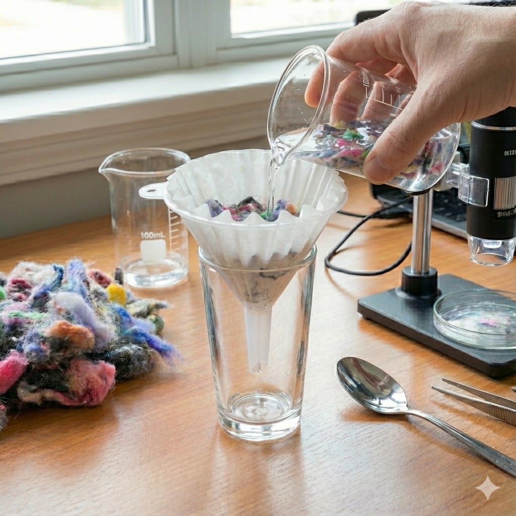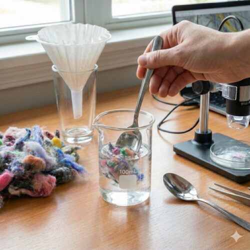 Place the funnel into the glass. Add the filter paper to the funnel and pour the suspension through the filter paper. Option 1 – Investigate the filter paper. Allow the filter paper to dry. Once the filter paper has dried, place the paper under the digital microscope (scrape this onto a glass slide for a standard microscope). Can you count how many distinct coloured lint fibres there are? Additionally, how many of these fibres will form microplastics? Synthetic Fibres (Polyester, Nylon, Acrylic) These usually look like fishing lines. They are often uniform in thickness, very smooth, long, and may be shiny under a light source. These are the microplastics. Natural Fibres (Cotton, Wool) These tend to look rougher. Cotton often looks like a twisted ribbon or has frayed edges. Wool may look scaly (like human hair).