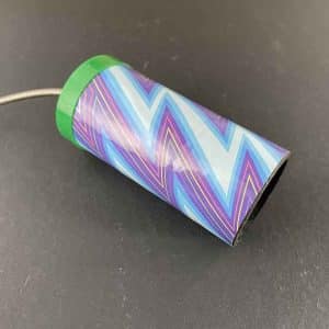 • A blue Mini thunder drum up close. There are zig zag patterns around the cylinder