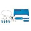 • The buzz wire making kit features a blue base with a wobbly wire conencted to a buzzer. A metal loop is hanging on the wobbly wire.