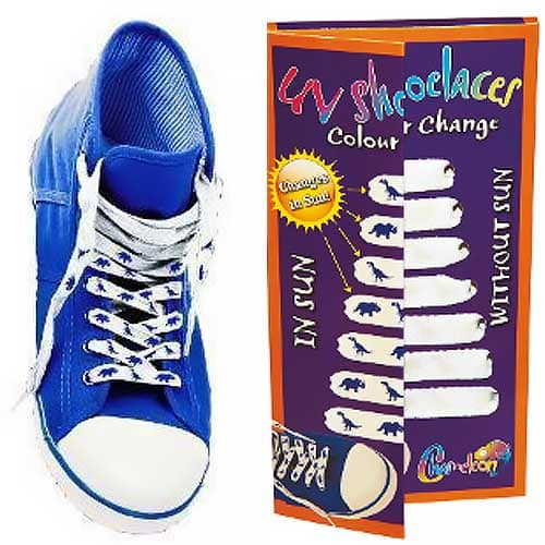 • The packet for colour change shoelaces. There are white laces on one side and blue dinosaurson the other