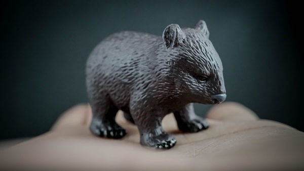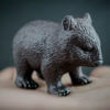 • Person holding in the palm of their hand a replica of a common wombat. Front view