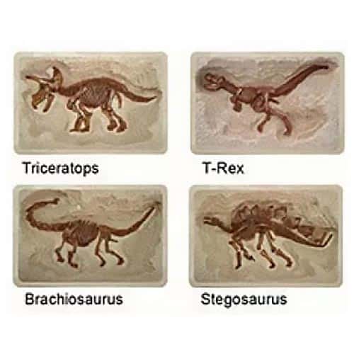 • A box with a picture of a dinosaur skeleton being excavated by a hammer and chisel