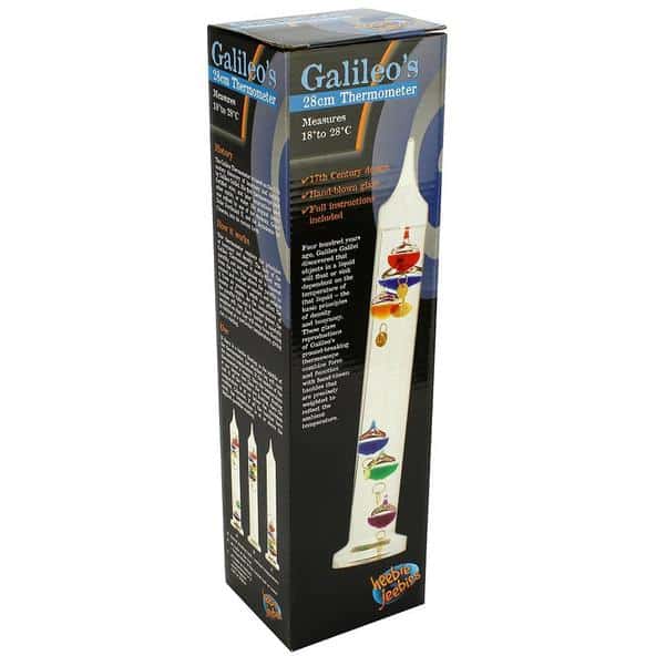 Galileo thermometer 28cm next to the box . There are three coloured balls at the top of the thermometer and three coloured balls at the bottom of the thermometer.