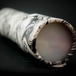 • Yellow Vortex valve connecting tow bottles together. Orange liquid is swirling in the top bottle and forming a tornado shaped vortex as it swirls into the bottom bottle