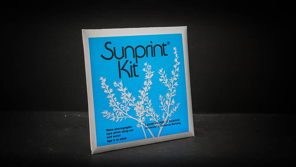 • Sunprint Kit on a white background. There is a leaflet next to a cunprint paper that now has a white outline of the leaftlet, with the rest of the paper now blue due to sunlight