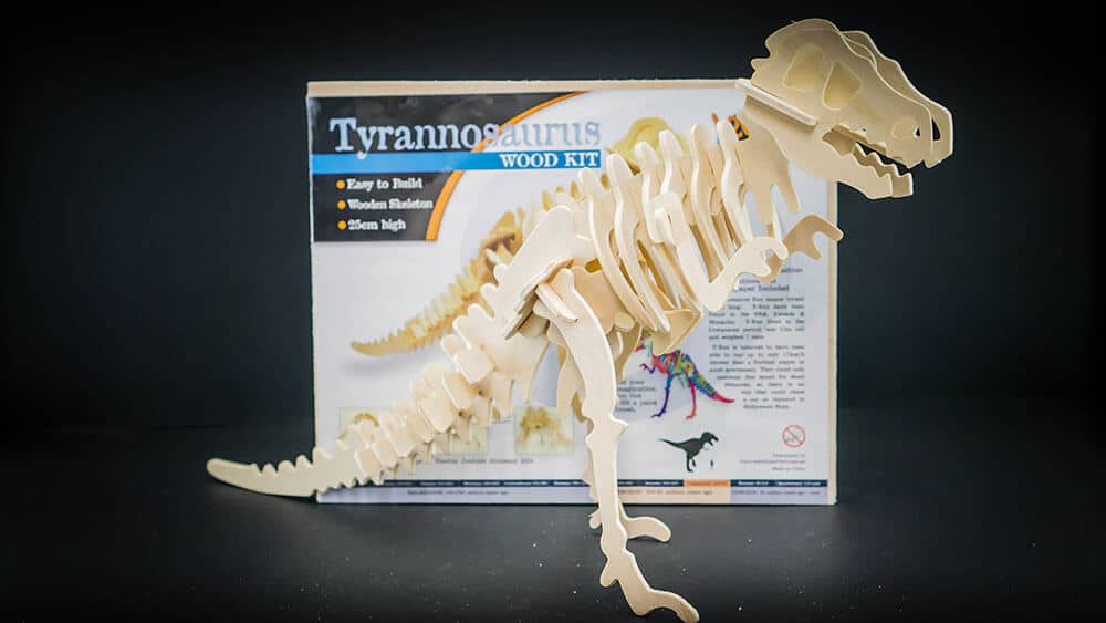 • T-Rex Dinosaur woodcraft Excavation kit with information about the wooden T-Rex