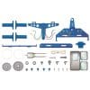 • tin cable car kit materials, showing a variety of blue & grey plastic parts and a motor with wires