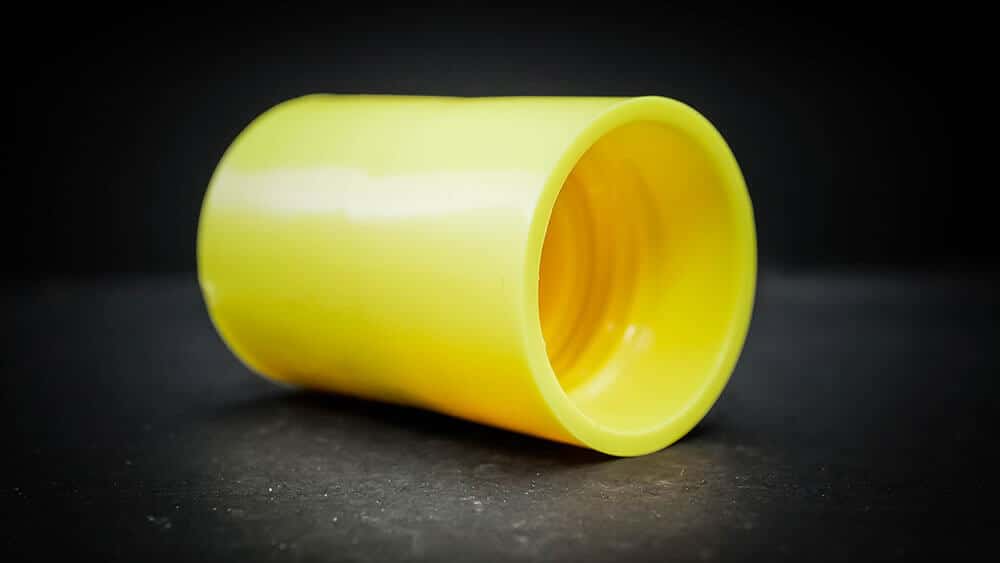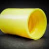 • Yellow Vortex valve connecting tow bottles together. Orange liquid is swirling in the top bottle and forming a tornado shaped vortex as it swirls into the bottom bottle