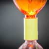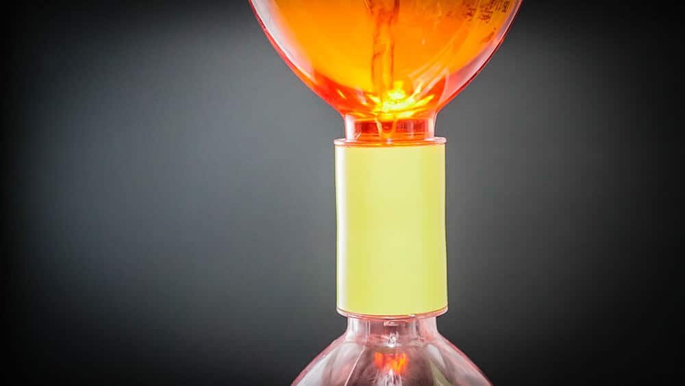 Yellow Vortex valve connecting tow bottles together. Orange liquid is swirling in the top bottle and forming a tornado shaped vortex as it swirls into the bottom bottle