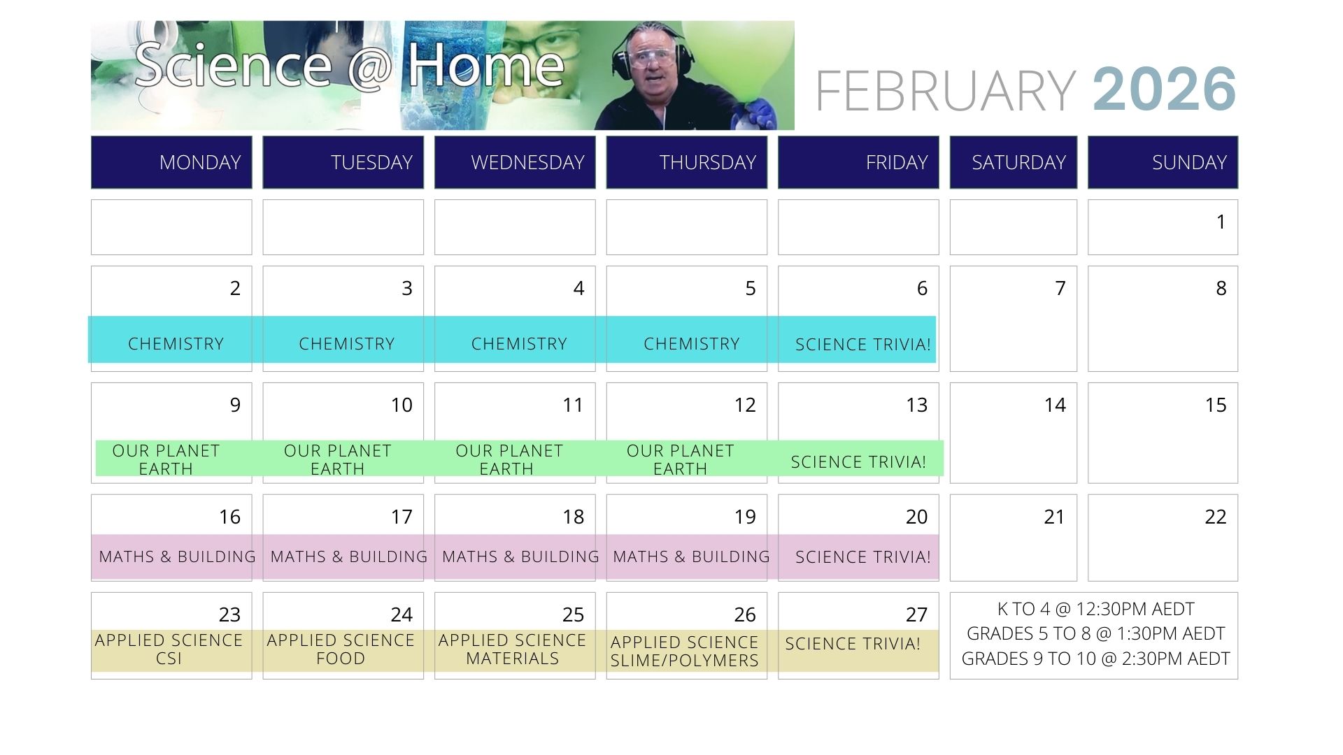 Week 2 Science @ Home Program Our Planet Earth Grades K to 4 Students will be introduced to the basic elements of weather and how natural disasters form, as well as an introduction to ocean science. Investigate patterns of weather and cloud formation. Discover why weathering causes erosion. Learn what causes volcanoes and earthquakes and learn how the environment changes as dive into the deep ocean. How clouds form Volcanoes & Earthquakes Erosion Our oceans February 9 to 13 at 12:30pm AEDT (Sydney UTC +11) You can convert your timezone here Grades 5 to 8 This week will focus on how natural disasters form, the rock cycle, and factors that affect our oceans. Investgate how convection works in our weather systems, influencing our climate. Learn about plate tectonics. Discover how light, pressure, temperature and more affect life underater. Convection & climate Volcanoes & Earthquakes The rock cycle Factors that affect life underwater February 9 to 13 at 1:30pm AEDT (Sydney UTC +11) You can convert your timezone here Grades 9 to 10 This week will focus on how natural disasters form and affect the planet, the rock cycle and how to identify rocks and minerals, and the science of our oceans. Investigate global weather patterns and the influence of the oceans on our climate. Learn about the structure of the Earth and force is measured in earthquakes and volcanoes. Learn geological techniques to idenify rock types. Look at the abiotic factors that affect life underwater. Weather, pressure & climate Volcanoes, Earthquakes & the structure of the Earth The rock cycle & identification techniques for rock types Water pressure, light attentuation, salinity & currents February 9 to 13 at 2:30pm AEDT (Sydney UTC +11) You can convert your timezone here Optional materials needed for hands-on activities February 9 Funnel, ping pong ball. Glass jar with lid (full of water), detergent, Shaving cream A plastic cup filled with water A straw Blue food colouring February 10 Ping pong ball, toilet roll, tape, optional plate, baking tray with a sand pile on it, 1 cup of water, 1 empty cup, bicarbonate soda, vinager, detergent, food colouring, towels for spills February 11 Rocks of different types, nail, coin, different colours of dough or playdough (enough to fill up at least 4cm of the container), straw or sturdy tube, small container February 12 Lemonade or soda water, clear plastic cup, sultanas, towels for spills February 13 – TRIVIA We will be using Kahoot! Your child can participate by opening a new browser window and going to kahoot.it on the same device used to join the webinar, OR use a second device to play while simultaneously watching the webinar…whichever suits! You can help your child by opening the page before the workshop, and all they have to do later in the session is type in the game code. Curriculum links Australian ACARA Content Outcomes: Science Primary School Observable changes occur in the sky and landscape (ACSSU019). Earth’s surface changes over time as a result of natural processes and human activity (ACSSU075). Sudden geological changes or extreme weather conditions can affect Earth’s surface (ACSSU096). High School Sedimentary, igneous and metamorphic rocks contain minerals and are formed by processes that occur within Earth over a variety of timescales (ACSSU153) The theory of plate tectonics explains global patterns of geological activity and continental movement (ACSSU180) NSW Science & Technology Syllabus Content A student: ST1-10ES-S recognises observable changes occurring in the sky and on the land and identifies Earth’s resources ST2-10ES-S investigates regular changes caused by interactions between the Earth and the Sun, and changes to the Earth’s surface ST3-10ES-S explains regular events in the solar system and geological events on the Earth’s surface Science and Technology K–6 Syllabus (Implementation from 2027) A student: STE-SCI-01 identifies and describes characteristics of living things, properties of materials, and movement STE-PQU-01 poses questions based on observations to collect data ST1-SCI-01 measures and describes changes in living things, materials, movement, Earth and the sky ST1-PQU-01 poses questions based on observations and information to investigate cause and effect ST2-SCI-01 uses information to investigate the solar system and the effects of energy on living, physical and geological systems ST2-PQU-01poses questions to create fair tests that investigate the effects of energy on living things and physical systems ST3-PQU-01 poses questions to identify variables and conducts fair tests to gather data NSW Science 7–10 Syllabus (Implementation from 2026) A student: describes the dynamic nature of models, theories and laws in developing scientific understanding of the Earth and Solar System SC4-12ES describes changing ideas about the structure of the Earth and the Universe to illustrate how models, theories and laws are refined over time by the scientific community. SC5-12ES explains how advances in understanding of processes that occur within and on the Earth, influences the choices people make about resource use and management. SC4-13ES explains how scientific knowledge about global patterns of geological activity and interactions involving global systems can be used to inform decisions related to contemporary issues. SC5-13ES Victorian F – 10 Science Curriculum Primary School Earth’s resources are used in a variety of ways (VCSSU047) Participate in guided investigations, including making observations using the senses, to explore and answer questions (VCSIS051) Earth’s surface changes over time as a result of natural processes and human activity (VCSSU062) Sudden geological changes or extreme weather conditions can affect Earth’s surface (VCSSU079) High School Sedimentary, igneous and metamorphic rocks contain minerals and are formed by processes that occur within Earth over a variety of timescales (VCSSU102) The theory of plate tec